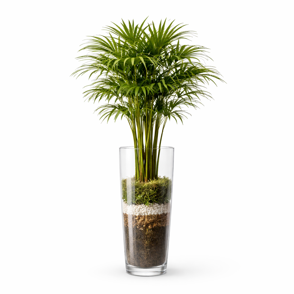 Elegância clássica para estandes que precisam transmitir sofisticação e acolhimento. A Raphis de 1,50m com vaso em vidro é ideal para compor ambientes corporativos, recepções e áreas de circulação, trazendo um visual natural e refinado sem necessidade de manutenção.